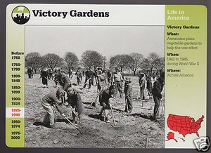 Victory gardens, also called war gardens or food gardens for defense, were vegetable, fruit and herb gardens planted at private residences and public parks in United States, United Kingdom, Canada and Germany[1] during World War I and World War II to reduce the pressure on the public food supply brought on by the war effort. ... Read Content